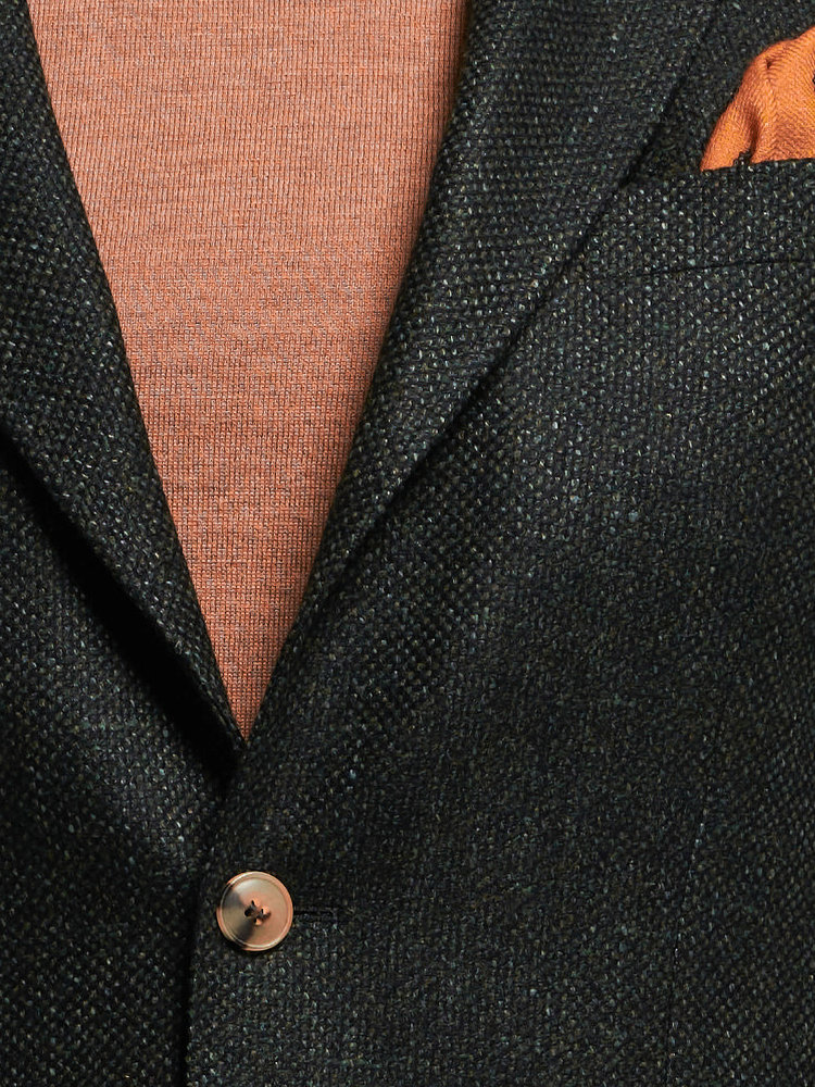 This DAPPER is a slim fit jacket in a luxurious green wool and cashmere blend woven by Italian mill Drago.