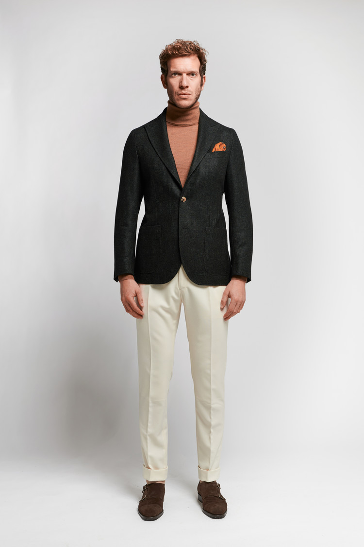 The rich, woollen texture of this jacket goes very well with similar fabrics. We like to wear it with a roll neck jumper, in either camel or navy, and a pair of cream flannel trousers. The green also looks great on denim (as a shirt or jeans).