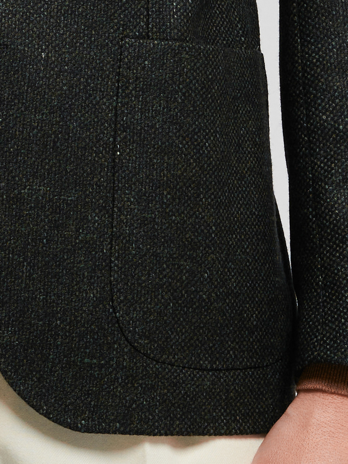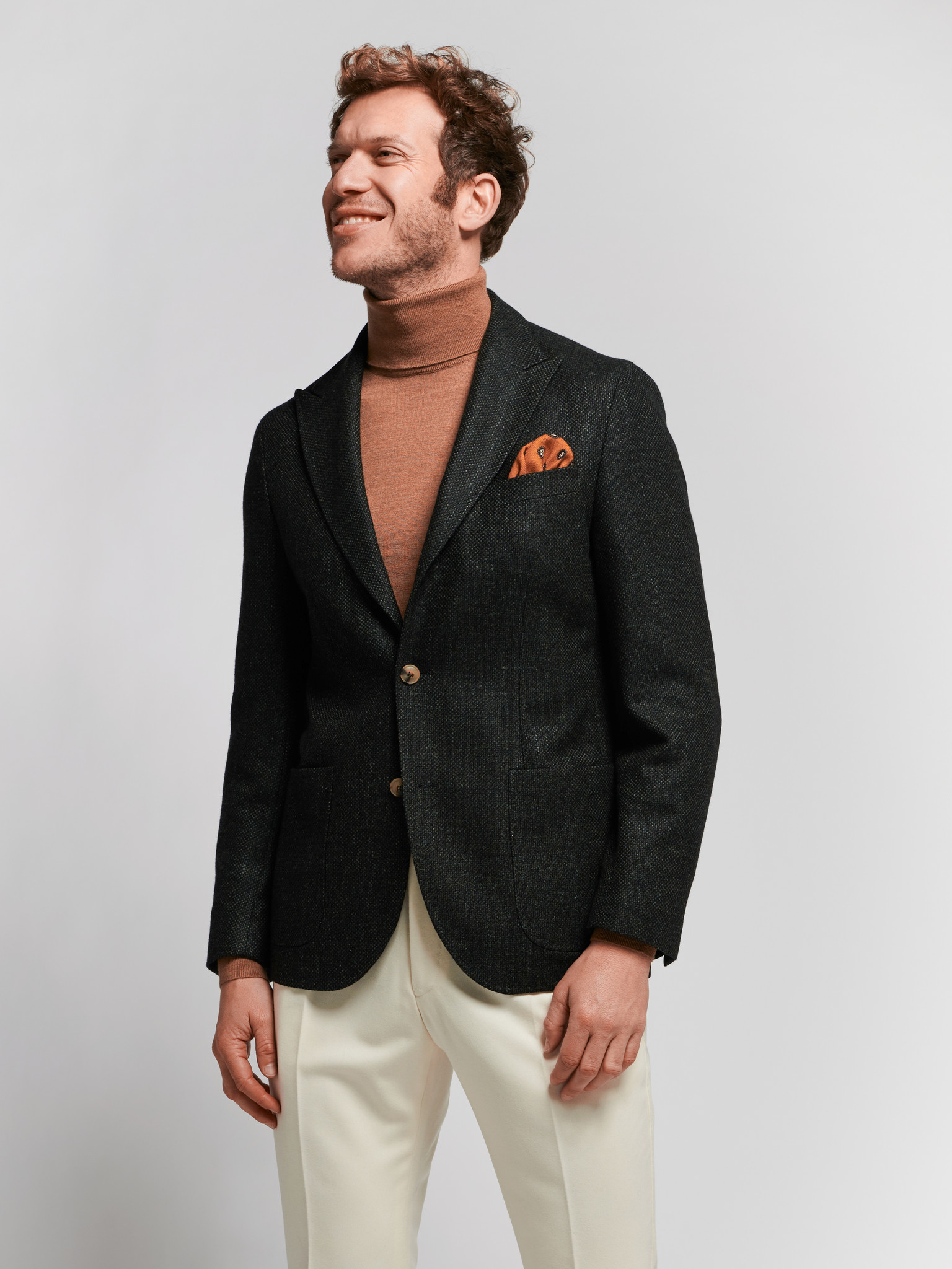 The rich, woollen texture of this jacket goes very well with similar fabrics. We like to wear it with a roll neck jumper, in either camel or navy, and a pair of cream flannel trousers. The green also looks great on denim (as a shirt or jeans).