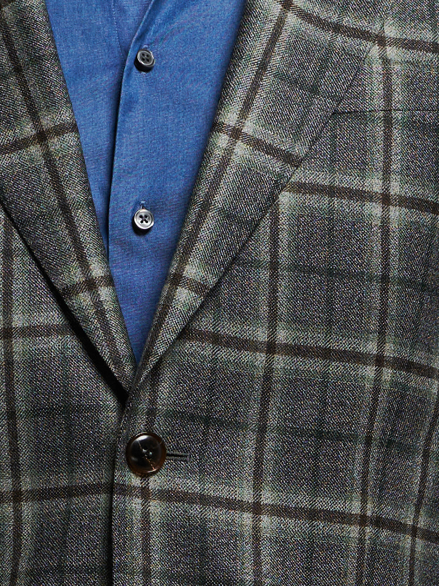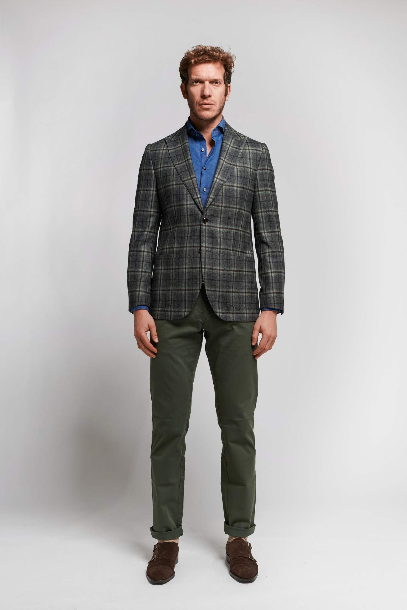 We like pairing checked jackets with solid shirts and trousers. But solid doesn’t mean boring. We think it’s cool to play with the hint of green in the jacket by wearing it with our dusty olive chinos. Denim shirts are always a good idea with a grey, textured jacket.