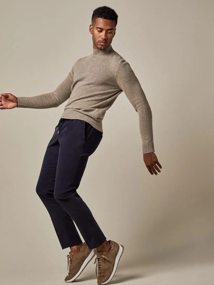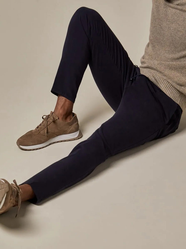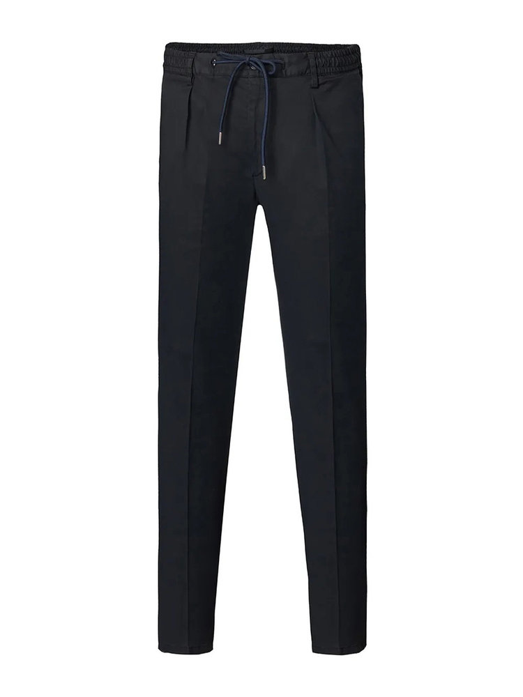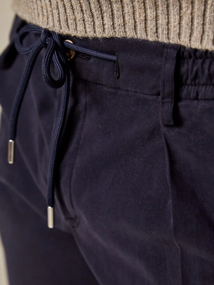• This navy sportcord is the most comfortable trouser in the collection. Made of a soft Lyocell-cotton Italian fabric, an all around elastic waistband and added stretch for extra comfort. You can wear the cord inside or outside, whatever you like.
