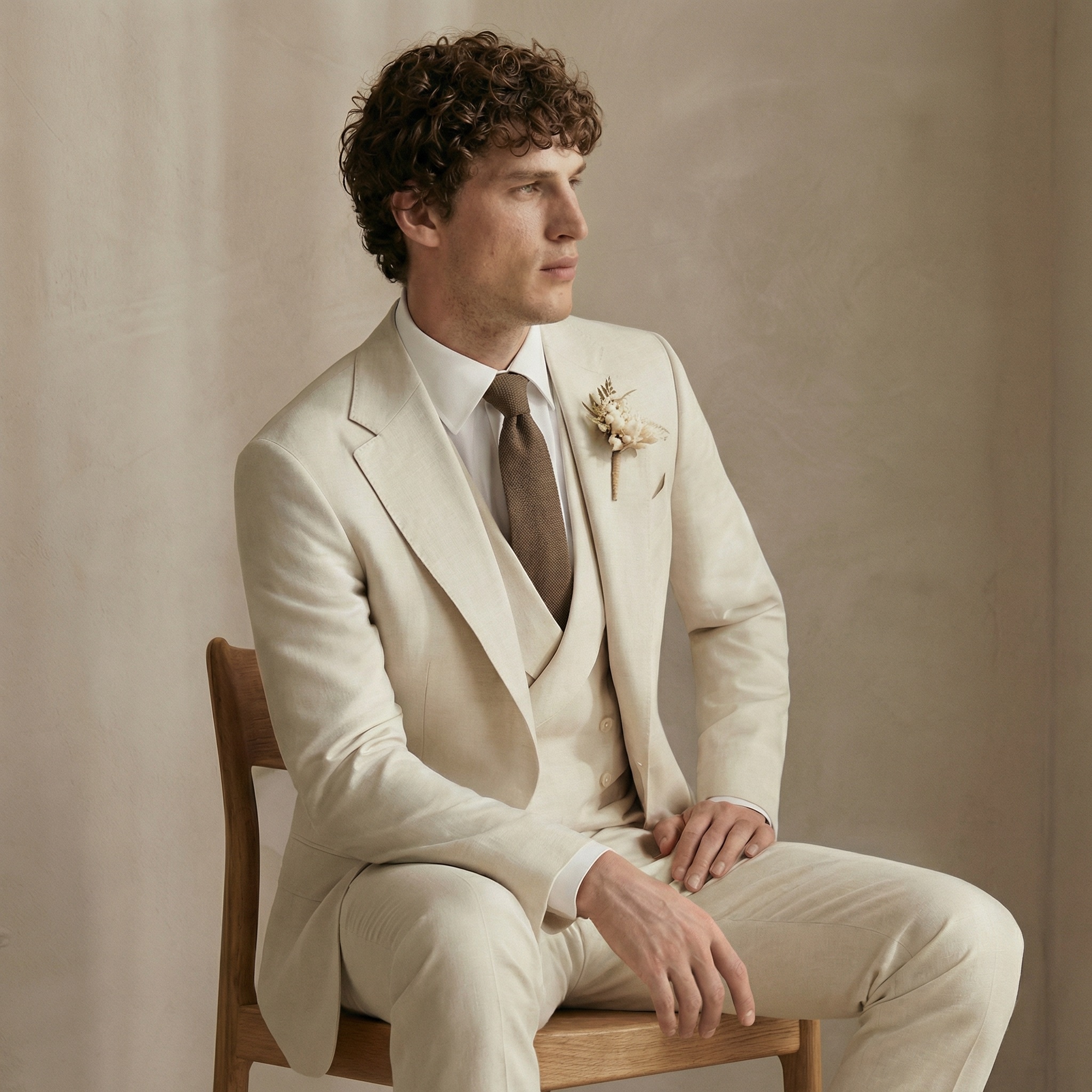 Als het gaat om stijlen, springen er dit seizoen een aantal duidelijke favorieten uit. Het driedelige pak blijft een sterke trend voor de bruidegom — en dat is niet zonder reden. Het tilt je look naar een hoger niveau dan die van je gasten en zorgt ervoor dat je er ook zonder jasje verzorgd uitziet.