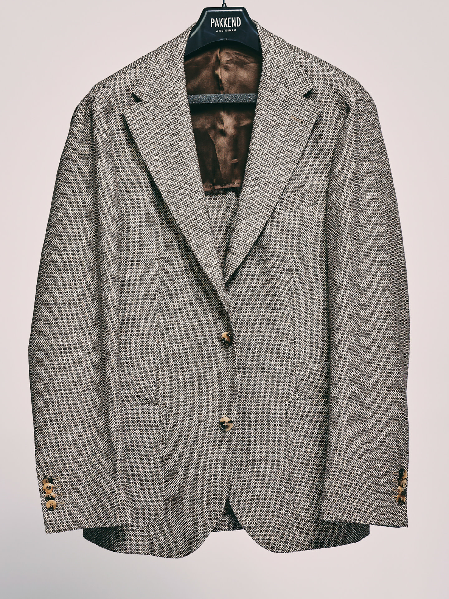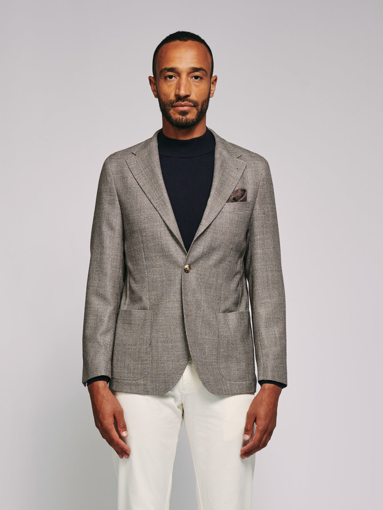 Deze BOLO is een slim fit jasje in een bruine birdseye wol van de Italiaanse wever Cerruti.