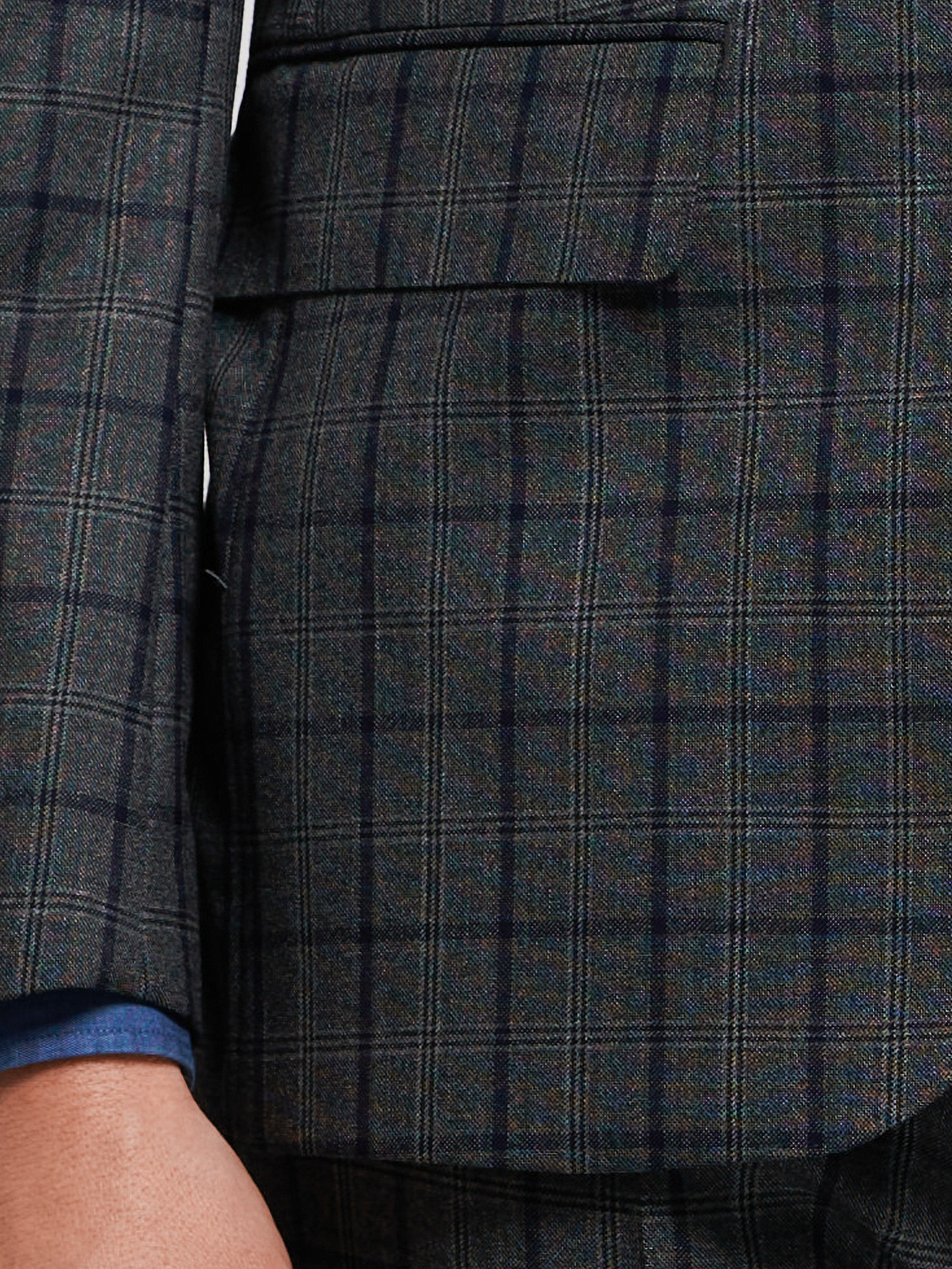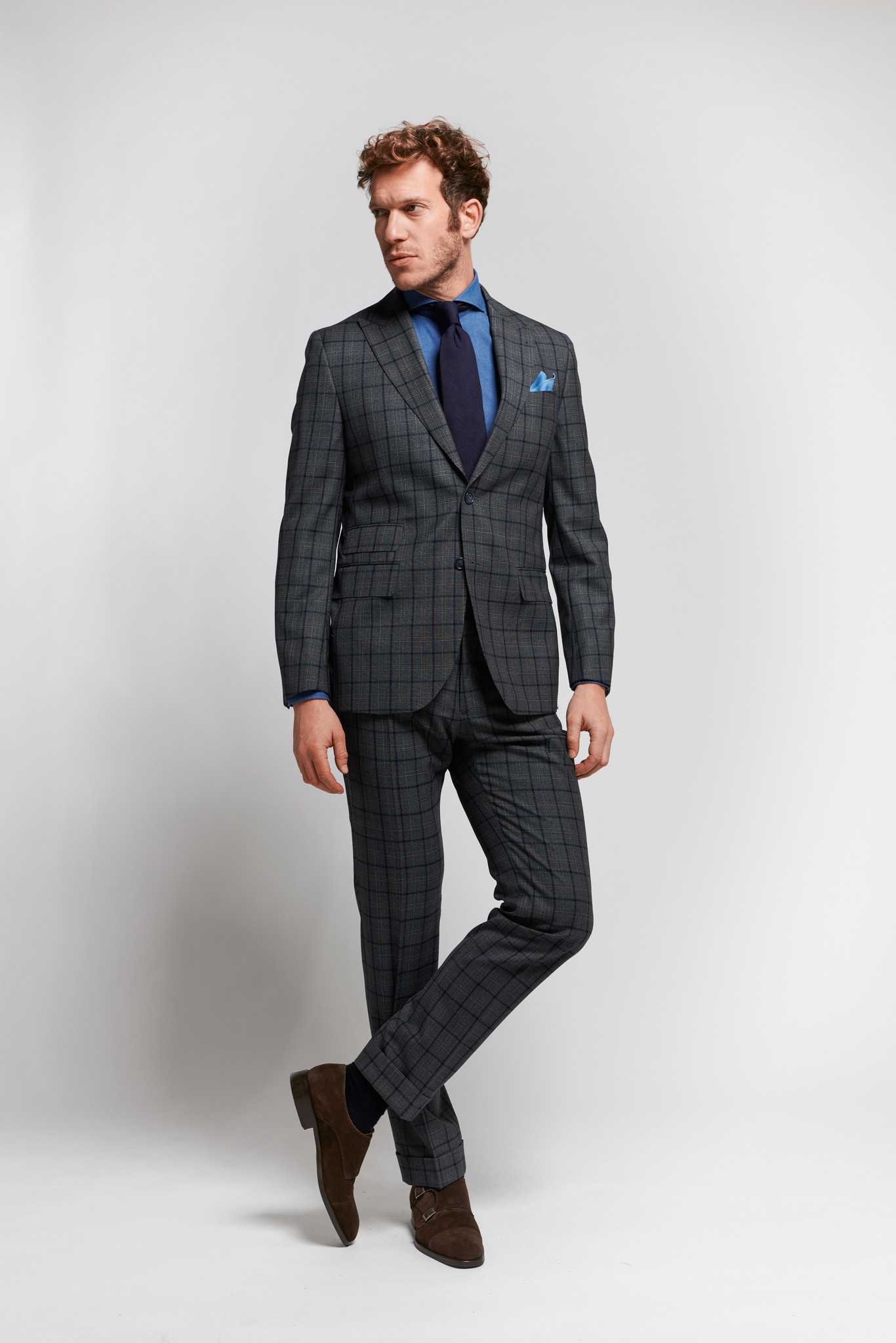 Deze DAPPER is een slim fit pak in een grijs met blauwe glen check wol van de Italianse wever Vitale Barberis Canonico.