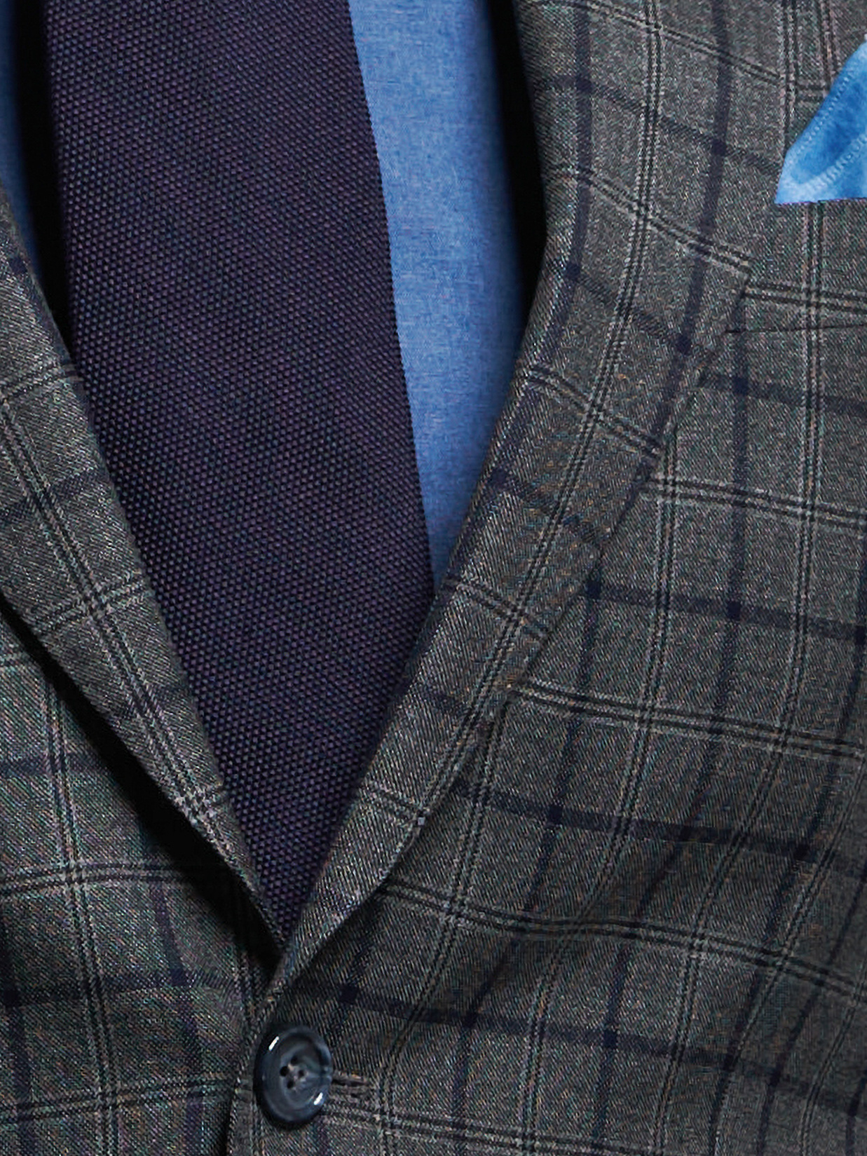Deze uitgesproken ruit combineert makkelijk met coolere tinten en effen kleuren. Een navy grenadine das en denim shirt is een mooie outfit. We dragen deze ook graag met een navy coltrui.